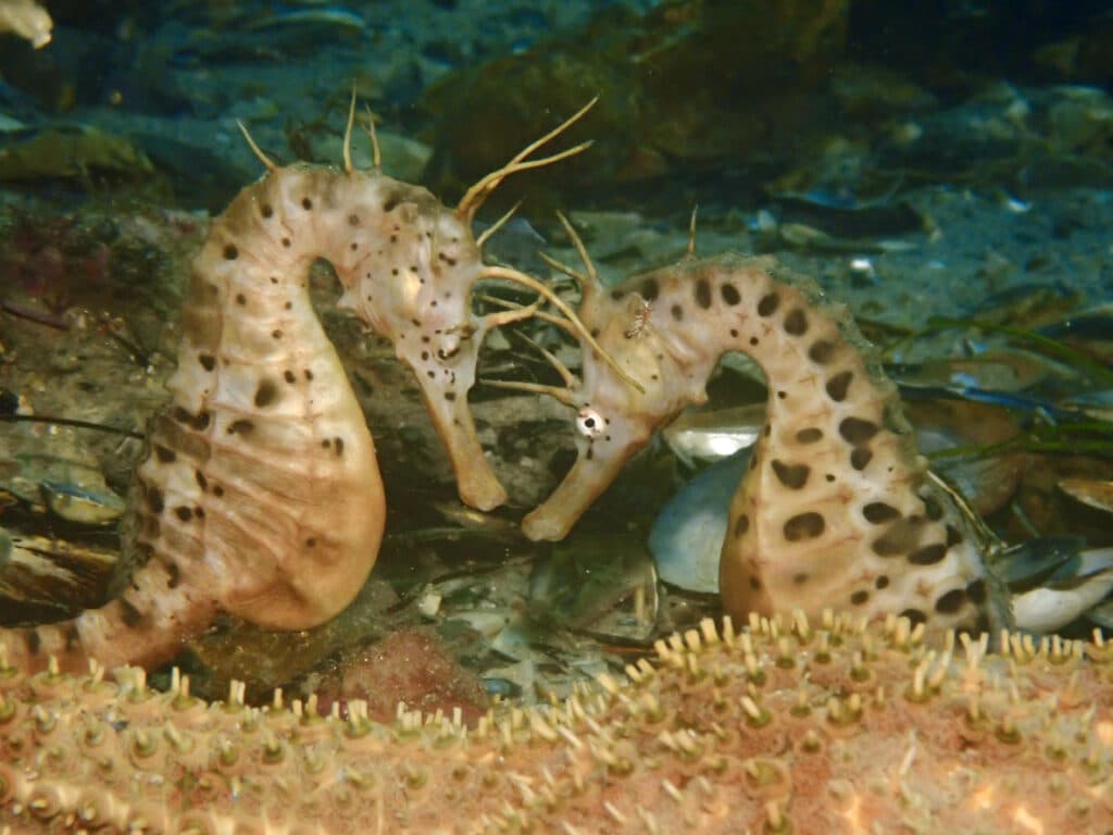 A seahorse is a small marine fish characterised by its unique horse-like head, curled tail, and upright posture. They are found in a variety of habitats, including seagrasses, mangroves, estuaries and coral reefs. You can even find seahorses off the coast of the UK.